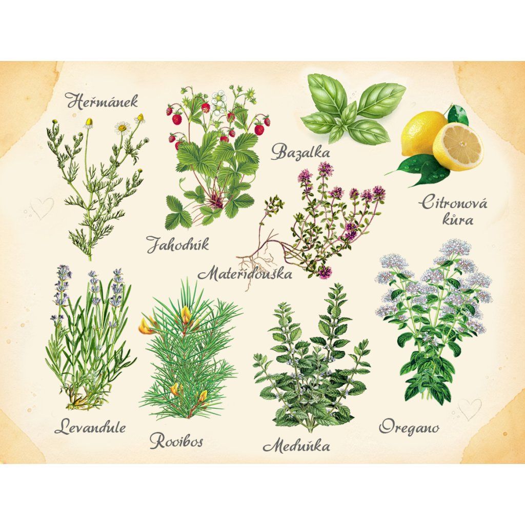 | Složení: | dobromysl obecná kvetoucí nať, heřmánek lékařský květ, bazalka pravá nať, jahodník obecný list, levandule lékařská květ, meduňka lékařská nať, mateřídouška obecná kvetoucí nať, Rooibos, citrónová kůra. |