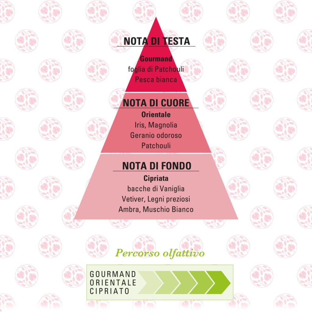 Začněte s originálním vrchním tónem, který překvapí sladkostí bílé broskve, a přejděte k srdci povýšenému ušlechtilými květy kosatce a magnólie. Tyto prvky se spojují s nejlákavějším vzácným pačuli, vytvářející harmonickou a fascinující vůni, jež probouzí emoce.