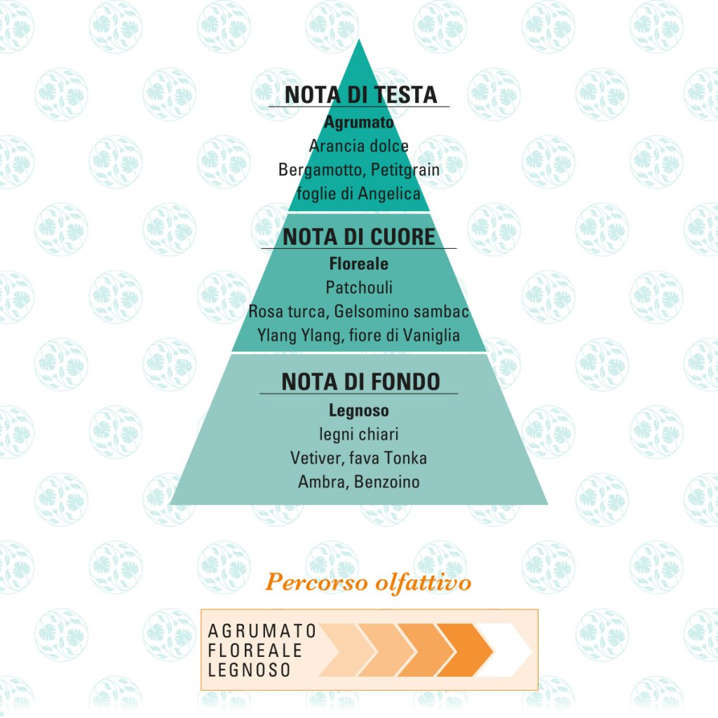 Buket se otevírá svěžími citrusovými tóny, které probouzejí smysly jiskrami sladkého pomeranče, bergamotu, petitgrainu a listů anděliky. Jiskřivé a živé tóny se pojí se smyslným srdcem, které odhaluje průhledné akordy jasmínu, turecké růže a květu Ylang Ylang. Nota se následně rozvíjí kolem výrazných akcentů pačuli a vetiveru a přechází do sofistikované orientální směsi tonky a ambry, které definují siluetu parfémované vody a zanechávají dlouhotrvající, hřejivý dojem.