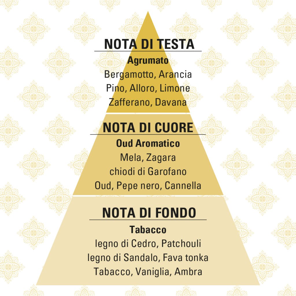 Čichový portrét okouzlujícího muže, který sedí na kožené pohovce, popíjí osvěžující perlivou vodu a plní si dýmku z cedrového dřeva tabákem. Jeho myšlenky jsou zahaleny vůní hustého kouře, jeho pohled upřen na stěnu knihovny plné starých knih, mezi nimiž vyniká otevřený herbář s ručně kreslenými ilustracemi černého pepře, skořice a hřebíčku. Zeměkoule je upřena na Východ, evokující vzdálené vůně ambry a oudových pryskyřic změkčených kulatou vanilkou. Klasická krása, na kterou se nezapomíná, s ohromující stopou, teplá a obklopující vůně, ideální pro dodání tajemství fascinujícímu, tradičnímu a charismatickému muži, který má však i svá tajemství a obavy.