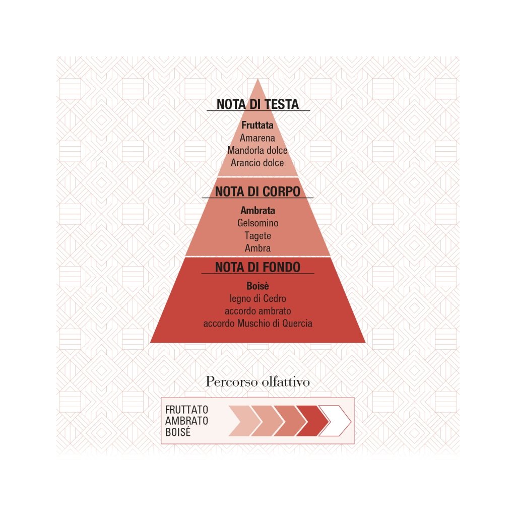 Úvod se vyznačuje divokým a smyslným čichovým otiskem, kde se výbušný kontrast mezi kyselostí a sladkostí Amarena, typický pro červené ovoce, mísí s jiskřivými a pikantními tóny sladkého pomeranče, směs je umocněna čistotou a vyvážeností sladké mandle.